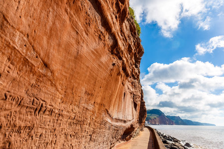 The sandstone rocks with dense greenery on the coast of the sea on a sunny day in Dawlish, UK