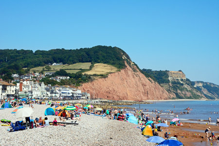 SIDMOUTH, UK - AUGUST 11, 2022 - Tourists relaxing on the beach with views towards town buildings and the cliffs at Pennington Point, Sidmouth, Devon, UK, Europe, August 11, 2022.