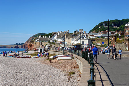 SIDMOUTH, UK - AUGUST 08, 2022 - Tourists relaxing on the beach and promenade with hotels overlooking the sea, Sidmouth, Devon, UK, Europe, August 08, 2022.