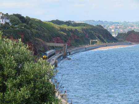 A diesel locomotive on the South Devon railway near Dawlish with red cliffs behind. High quality photo