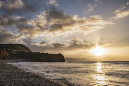 Beautiful sunrise landscape image of Ladram Bay beach in Devon England with stunning rock stacks on beach