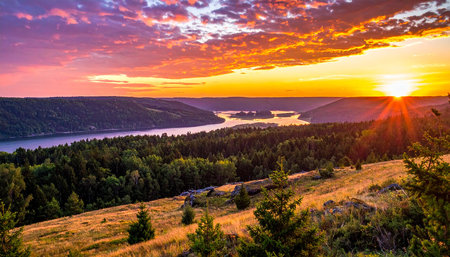 An aerial view captures a serene autumn river valley bathed in warm, golden sunlight. A wide, calm river meanders through the landscape, its surface reflecting the clear blue sky. The surrounding hills are densely covered with a vibrant mix of autumn trees, displaying hues of yellow, orange, and green. A gentle mist or haze hangs in the air, softening the distant hills and creating a sense of depth and atmosphere. Sunbeams pierce through the mist, illuminating patches of the forest. The...