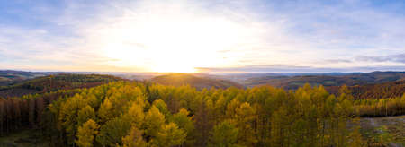Sunset over the Moravian-Silesian part of the Czech Republic in the Beskydy mountains. Orange glow of the sun in the early evening over a mixed forest. Wilderness.