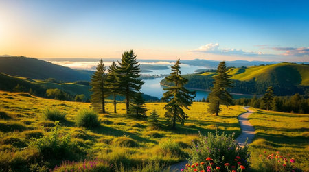 Gorgeous sunrise idyllic scenery, tranquil lakeside sea of flowers morning light