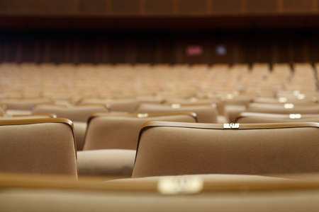 Empty cinema hall with a lot of beige armchairs, dim light
