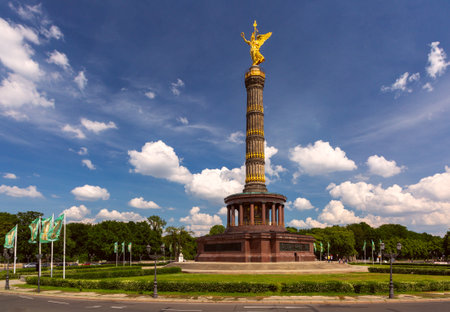 Victory Column in Berlin. Historic monument under bright sky. Golden statue Victory Column above Berlin. Tourists visit iconic Victory Column.
