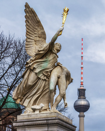 Winged woman statue on Schlossbruecke bridge with trees, cloudy sky and TV tower in the background. Designed by K. F. Schinkel in 1821 with sculptures of gods.