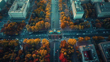 A city view with a lot of trees and buildings. The trees are orange and yellow, and the buildings are tall. Scene is peaceful and serene, with the trees providing a contrast to the busy city life
