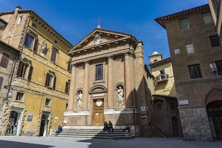 SIENA, ITALY - APRIL 8, 2018: Unidentified people by San Cristoforo church in Siena, Italy. This original Romanesque style church underwent a number of modifications and at 1800 a brick Neoclassical temple facade was added.