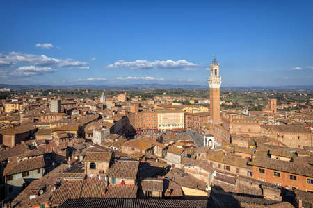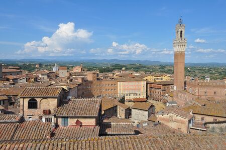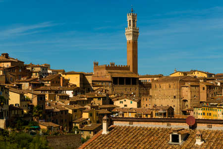 Medieval town Siena skyline view with historic buildings and Town Hall Bell Tower in Italy
