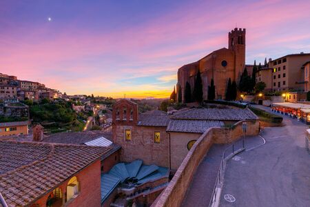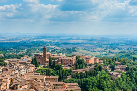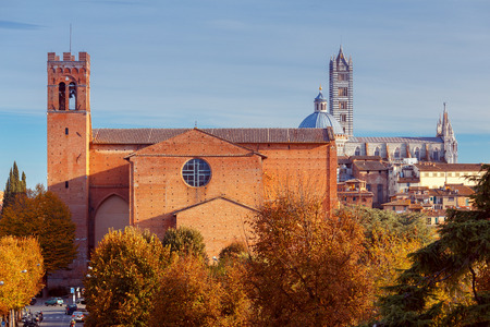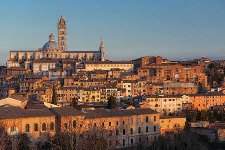 Cityscape of Siena, a beautiful medieval town in Tuscany, with view of the Dome Bell Tower of Siena Cathedral (Duomo di Siena), landmark Mangia Tower and Basilica of San Domenico, Italy