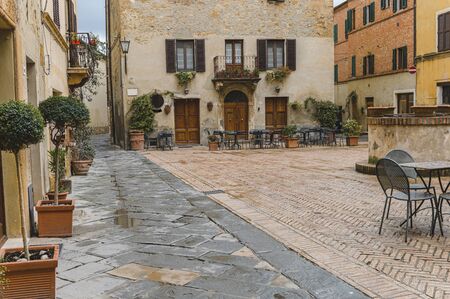 Walk on a rainy day through the streets of the beautiful town, Pienza, Tuscany