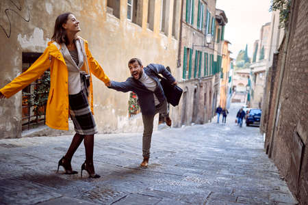A young elegant couple is having fun while walking in the city in a cheerful atmosphere. Walk, rain, city, relationship