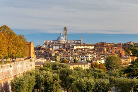 Panoramic aerial shot of Siena, cityscape, a beautiful medieval town in Tuscany, with view of the Dome Bell Tower of Siena Cathedral, landmark Mangia Tower and Basilica of San Domenico, Italy