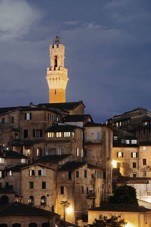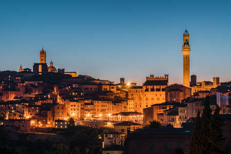 Medieval town Siena skyline view with Bell Tower and historic buildings in Italy at night