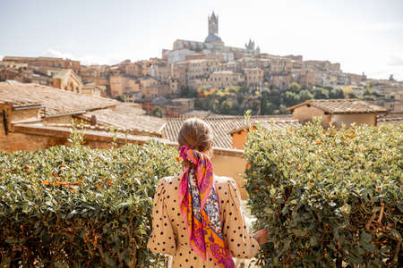 Stylish woman walks on background of cityscape of Siena old town. Concept of travel famous cities in Tosacny region of Italy