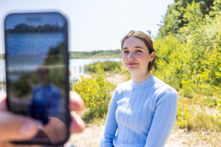 Smiling young couple family woman in blue clothes, man takes photo on mobile cell phone of his pretty wife at sunset outdoor at a lakeside in summer day. High quality photo