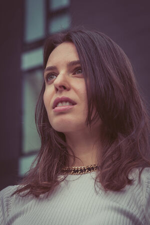 A young woman with curly, dark hair and a brown jacket stands in front of a brick building, looking directly at the camera with a serious expression.