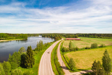 Aerial view of road between green summer forest and blue lake in Finland