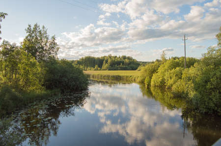 Calm river, clouds and bushes mirrored from water.