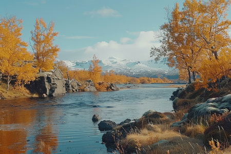 River with green and yellow trees on the shores under blue sky and clouds