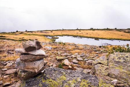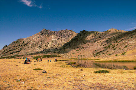 Claveles lagoon in the Sierra de Guadarrama, Madrid, Spain. Glacial lagoon located next to the Peñalara peak. Photography taken in summer visited by nature tourists.