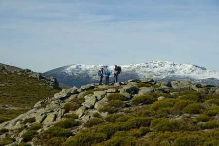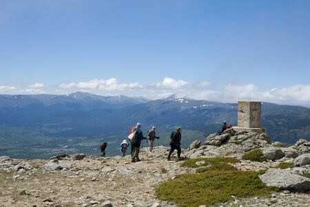 Lozoya, Spain May 25, 2019: group of walkers reaching a mountain top with a mountainous landscape in the background.