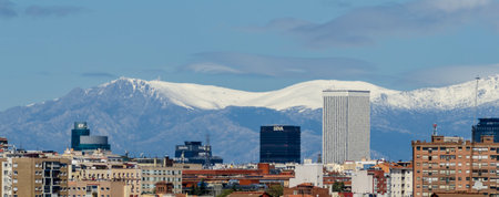 Panoramic cityscape of Madrid, view against Guadarrama mountain range
