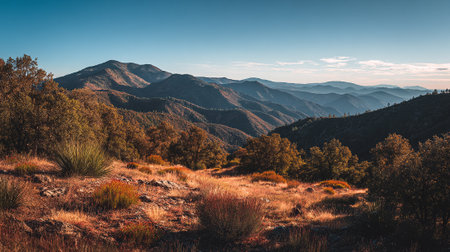 Serene Mountain Vista: Golden Foothills and Distant Blue Ridges Await