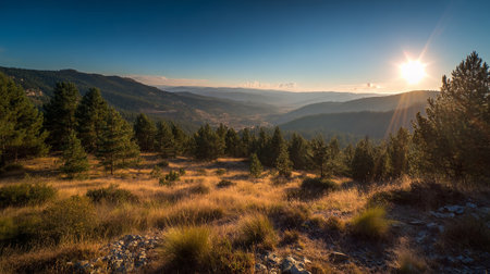 Beautiful Mountain Valley Landscape with Golden Grass at Sunset