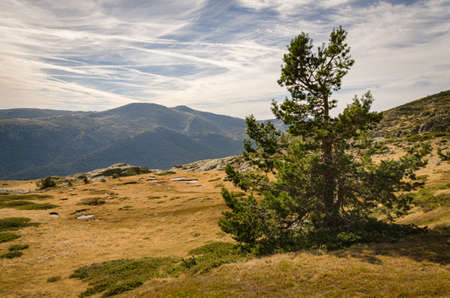 Isolated green pine tree on a mountain landscape on Guadarrama mountain range, Peñalara, Madrid, Spain