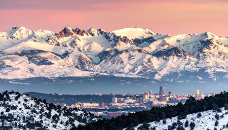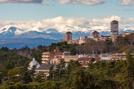 Panoramic view of Madrid, the capital of Spain, with the partially snow-covered mountains in the background.