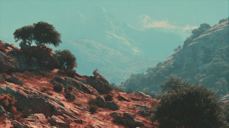 Capture the essence of tranquility in this serene landscape showcasing rocky hills, lush greenery, and distant mountains under a soft blue sky.