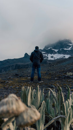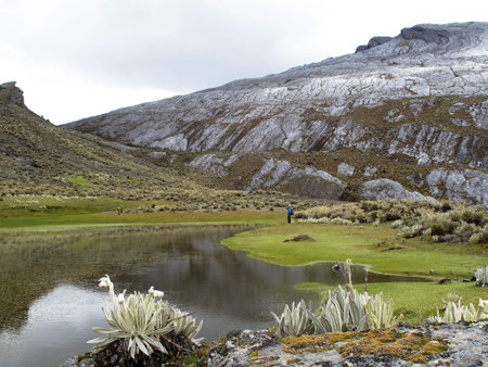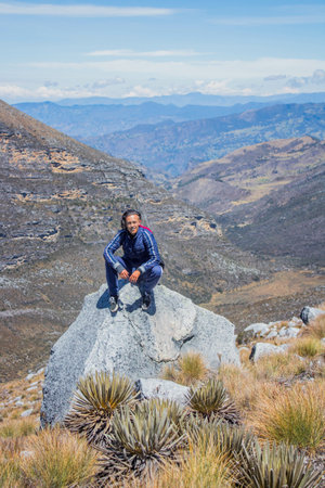 Hiker in colombian paramo highland of Cocuy National Park, surrounded by the beautiful Frailejones plants, Espeletia, Colombia, South America