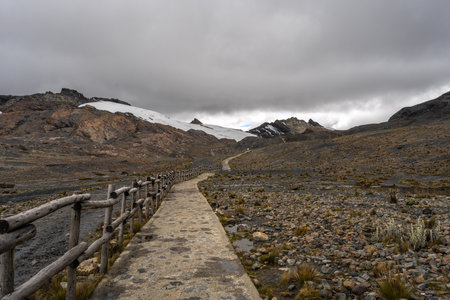A winding stone pathway leads towards the stunning Pastoruri Glacier in Huaraz, Peru. Towering snow-capped peaks contrast with dark volcanic rock, creating a dramatic high-altitude landscape. The region is known for its striking geological formations and glacial retreat