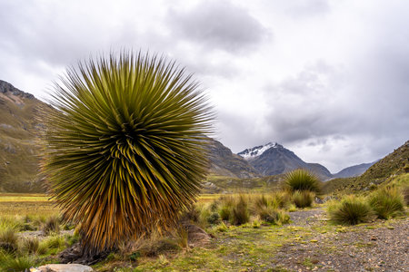 Puya Raimondi, the tallest bromeliad species, grows in the high-altitude Andean landscape along the Pastoruri Glacier trek in Huaraz, Peru. These rare plants bloom once in a century, reaching impressive heights before dispersing their seeds