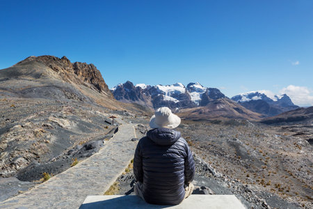 Trekker on the trail to Lagoon 69, on the valley of Huascaran mountains on Huaraz, Peruvian Andes