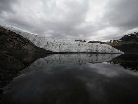 Panorama reflection view of Pastoruri Glacier snow ice lake Cordillera Blanca Huaraz Ancash Peru Andes South America