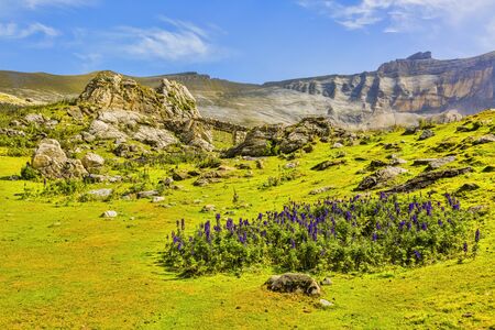 Violet flowers (Aconitum napellus) in the center of the glacial Circus of Troumouse, one of the largest from the Europe.