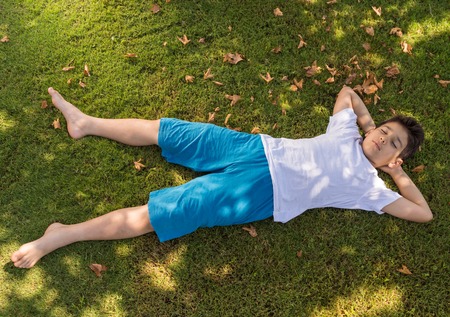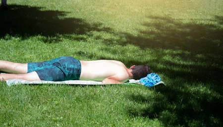 young man sleeping on the grass and sunbathing with the danger of not having any sun protection in summer