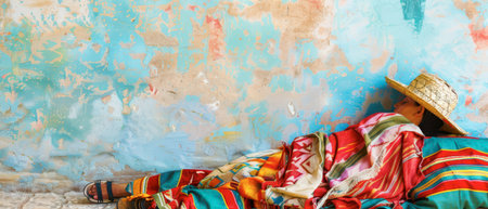 A person sleeps on the ground, covered in a colorful blanket and a large straw hat, with a blue and yellow wall behind them. The blanket is brightly colored with reds, yellows, and greens, and the wall is worn and textured, indicating an older building.