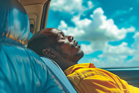 Generative AI Image of American Man Sleeping Inside Car with Bright Sky Background
