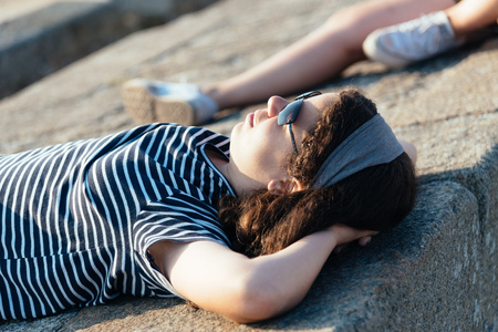 Portrait of beautiful girl relaxing lying on the walls facing the sun