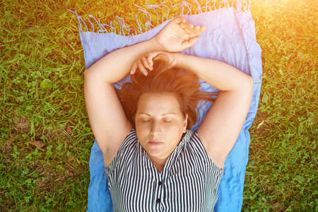 Charming young woman with hat sleeping on mat picnic felling relaxation. Teenager girl lying on the cloth picnic happiness while wellbeing in holiday. Lifestyle concept.