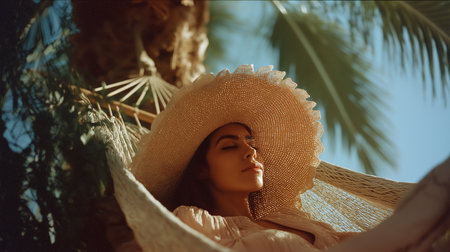 A person relaxes in a hammock, shaded by a sun hat and surrounded by palm trees.