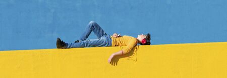 Front view of a young boy wearing casual clothes lying on a yellow fence against a blue wall while using a mobile phone to listening music