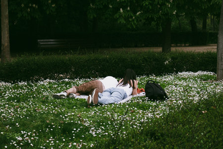 Madrid, Spain. May 1, 2024 Couple of people guy, and girl lying on green flowering lawn with blooming flowers in spring park, garden. Relaxing outdoor