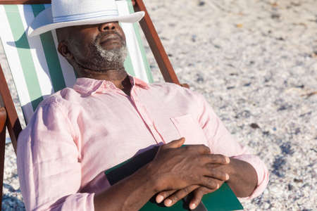 Retired african american senior man sleeping with book and hat over eyes on folding chair at beach. unaltered, active lifestyle, relaxation and holiday concept.