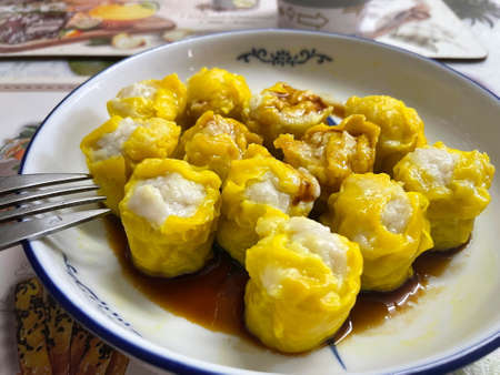 Homemade Chinese steamed shrimp dumpling or Shumai. selective focus