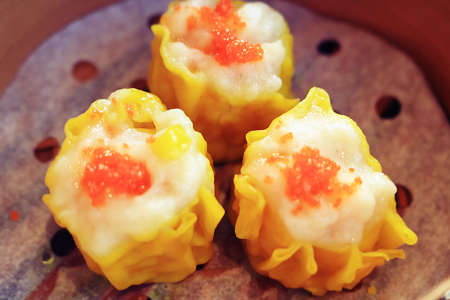 3 ShumaiCloseup shot of 3 prawn shumai with yellow wanton wrappings and orange cavia toppings